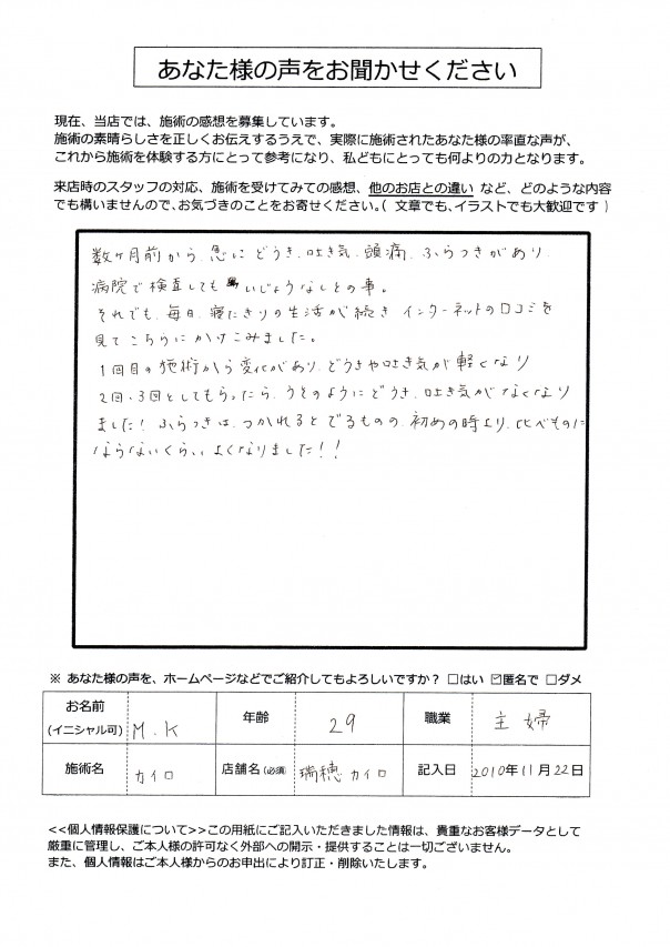1回目の施術から変化があり、動悸や吐き気が軽くなり2回、3回としてもらったら、