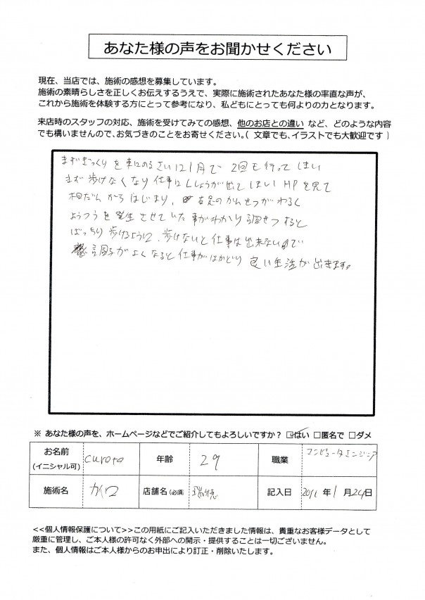 ぎっくり腰で来院の瑞穂町のCUROTOさんの喜びの声♪