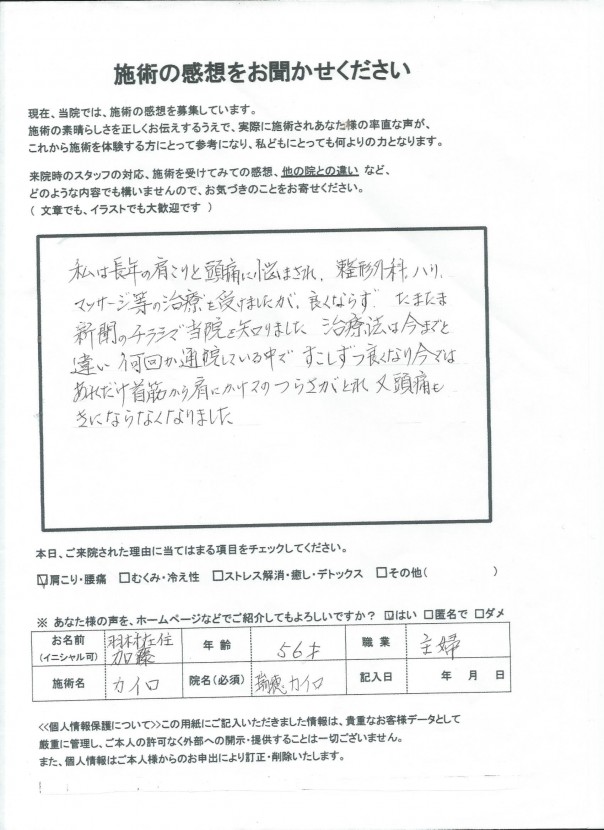 私は長年の肩こりと頭痛に悩まされ、整形外科、ハリ、マッサージ等の治療を受けましたが、