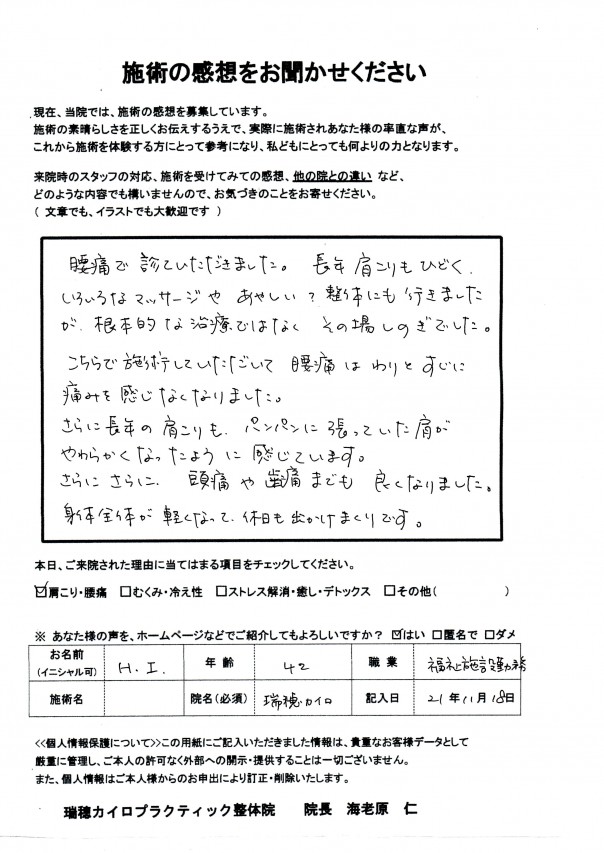 腰痛で来院された瑞穂町のH・Iさんの喜びの声♪