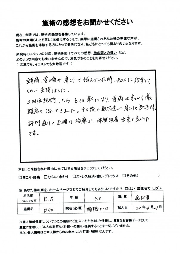 3回位施術したら、とても楽になり、首痛はすっかり消え頭痛も治ってきました。