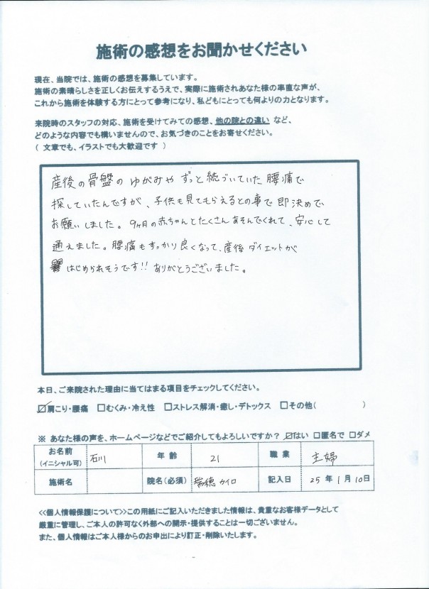 産後の骨盤矯正で来院の青梅市の石川さん