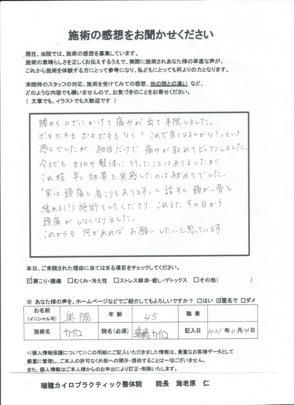 今までもカイロや整体に行ったことはありましたが、これ程早く効果を実感